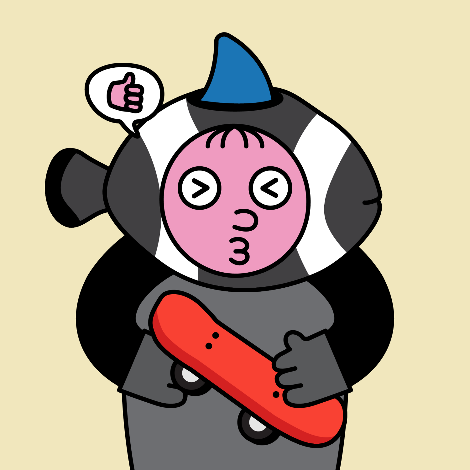 ArmsBlack33.28%BackgroundEarth11.50%DialogueThumbs Up11.09%EyesScrunched5.58%Face ColourStrawberry46.38%HairSparse Fringe10.04%Head MiddleBlack Clownfish0.43%Head TopBlue Shark1.91%Left HandGrey28.85%MouthO11.24%NoseButton10.78%PropSkateboard0.45%Right HandGrey28.85%ShirtPlain Grey6.38%TribeNeo-Capitalist20.02%