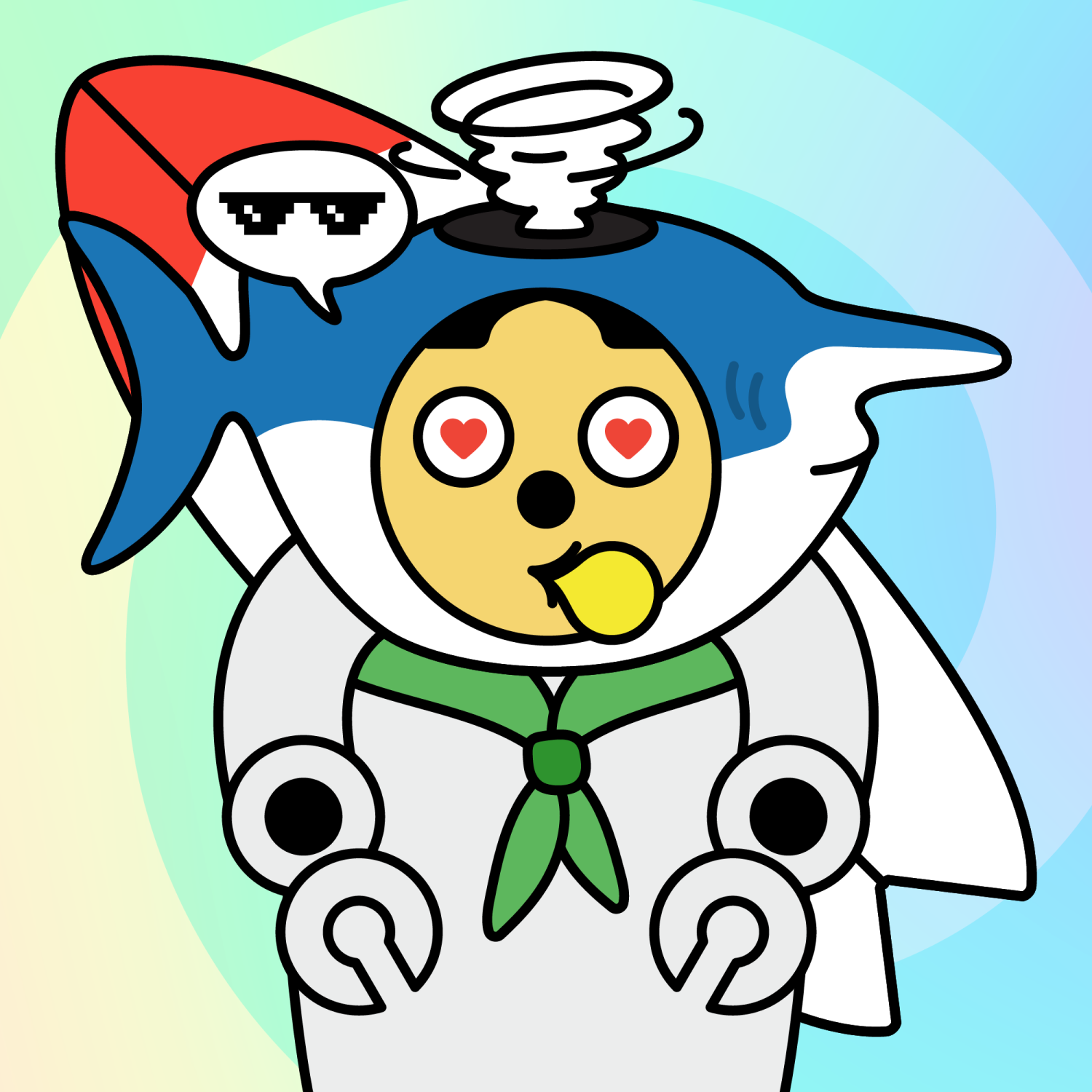 ArmsWhite33.38%BackgroundOcean3.29%DialogueThug3.31%EyesHeart1.65%Face ColourLemon23.14%HairCentre Parting10.07%Head MiddleBlue Goblin Shark0.53%Head TopTornado0.28%Left HandRobot3.43%MouthBubble Gum2.01%NoseBlack3.70%Right HandRobot3.43%ShirtGreen Bandana1.31%Special ToolRed Surfboard0.48%TribeNeo-Capitalist20.02%