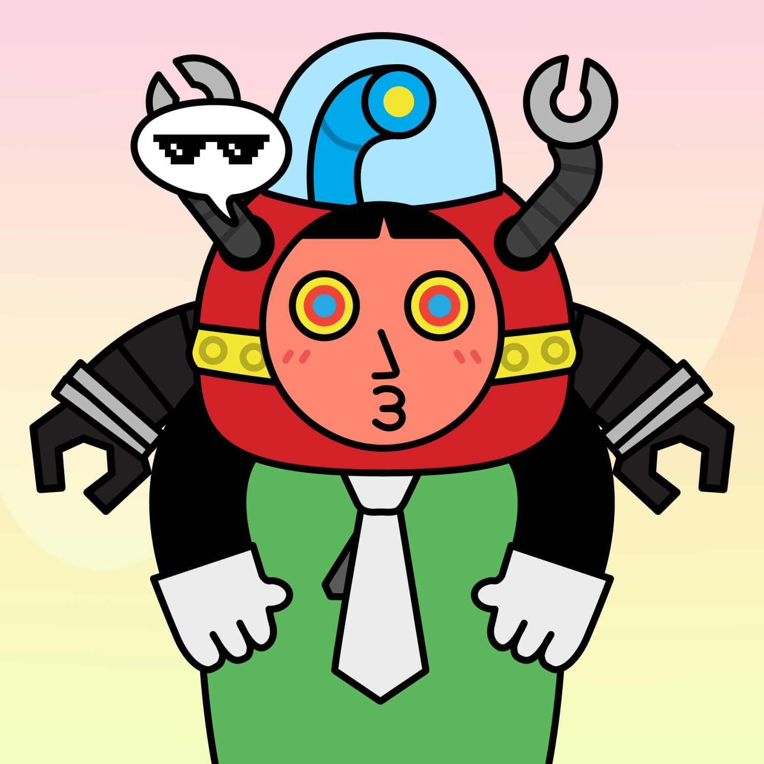 ArmsBlack33.28%BackgroundDawn3.29%CheekBlush3.68%DialogueThug3.31%EyesHypno1.47%Face ColourOrange22.69%HairThick Fringe9.57%Head MiddleRed Robot0.81%Head TopBlue Periscope1.96%Left HandWhite30.00%MouthO11.24%NoseSharp23.13%Right HandWhite30.00%ShirtWhite Tie0.75%Special ToolDark Robot0.98%TribeBuilder19.99%