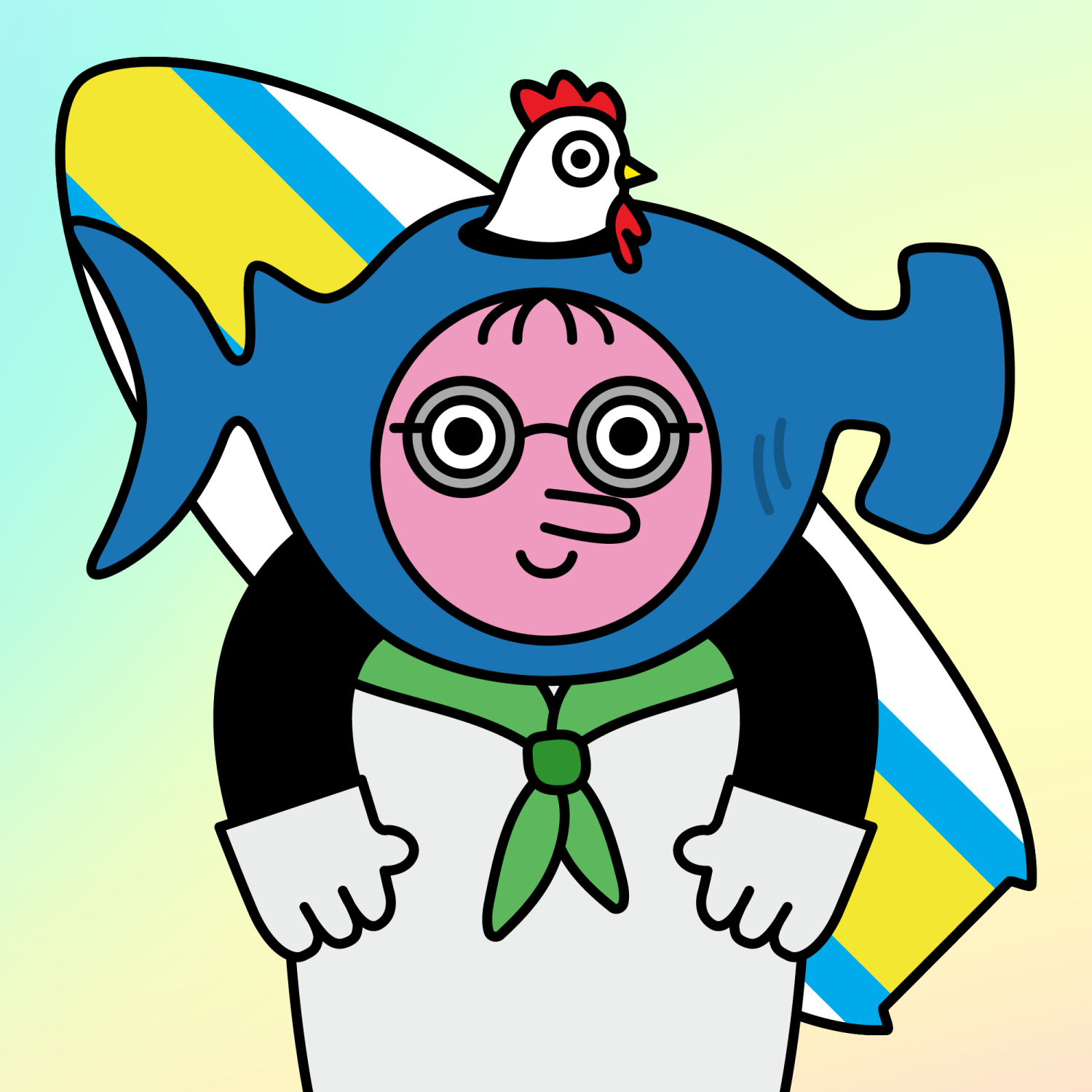 ArmsBlack33.28%BackgroundForest4.58%EyesGoggles1.85%Face ColourStrawberry46.38%HairSparse Fringe10.04%Head MiddleBlue Hammerhead Shark0.48%Head TopHen0.24%Left HandWhite30.00%MouthSmile21.06%NoseLong11.53%Right HandWhite30.00%ShirtGreen Bandana1.31%Special ToolYellow Paddleboard0.33%TribeNeo-Capitalist20.02%