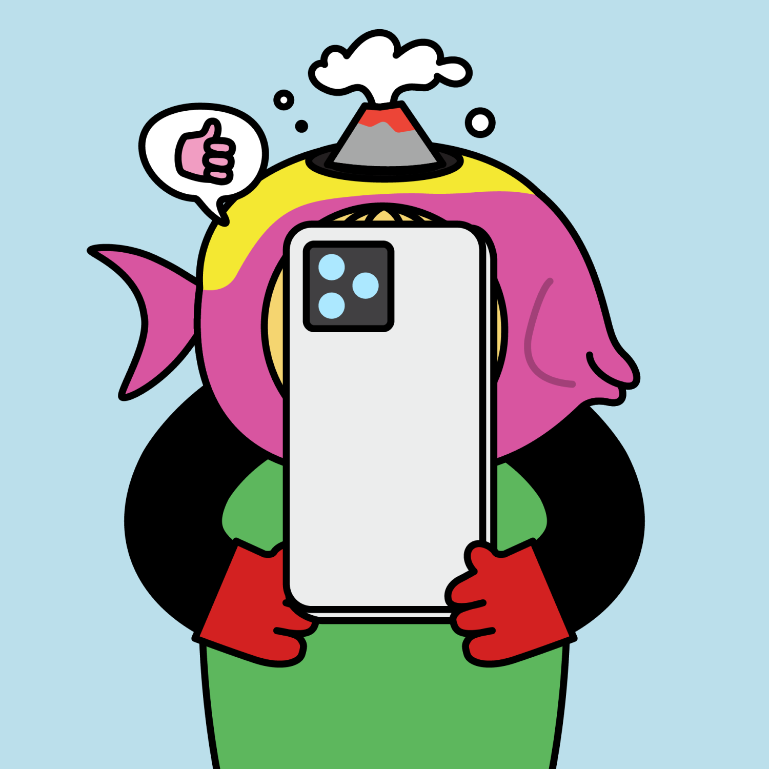 ArmsBlack33.28%BackgroundSky13.97%CheekRosy23.73%DialogueThumbs Up11.09%EyesOne14.86%Face ColourLemon23.14%HairSparse Fringe10.04%Head MiddlePink Tropical Fish1.49%Head TopVolcano1.76%Left HandRed32.25%MouthO11.24%NoseLong11.53%PropMoca Phone0.70%Right HandRed32.25%ShirtPlain Green9.09%TribeNeo-Capitalist20.02%