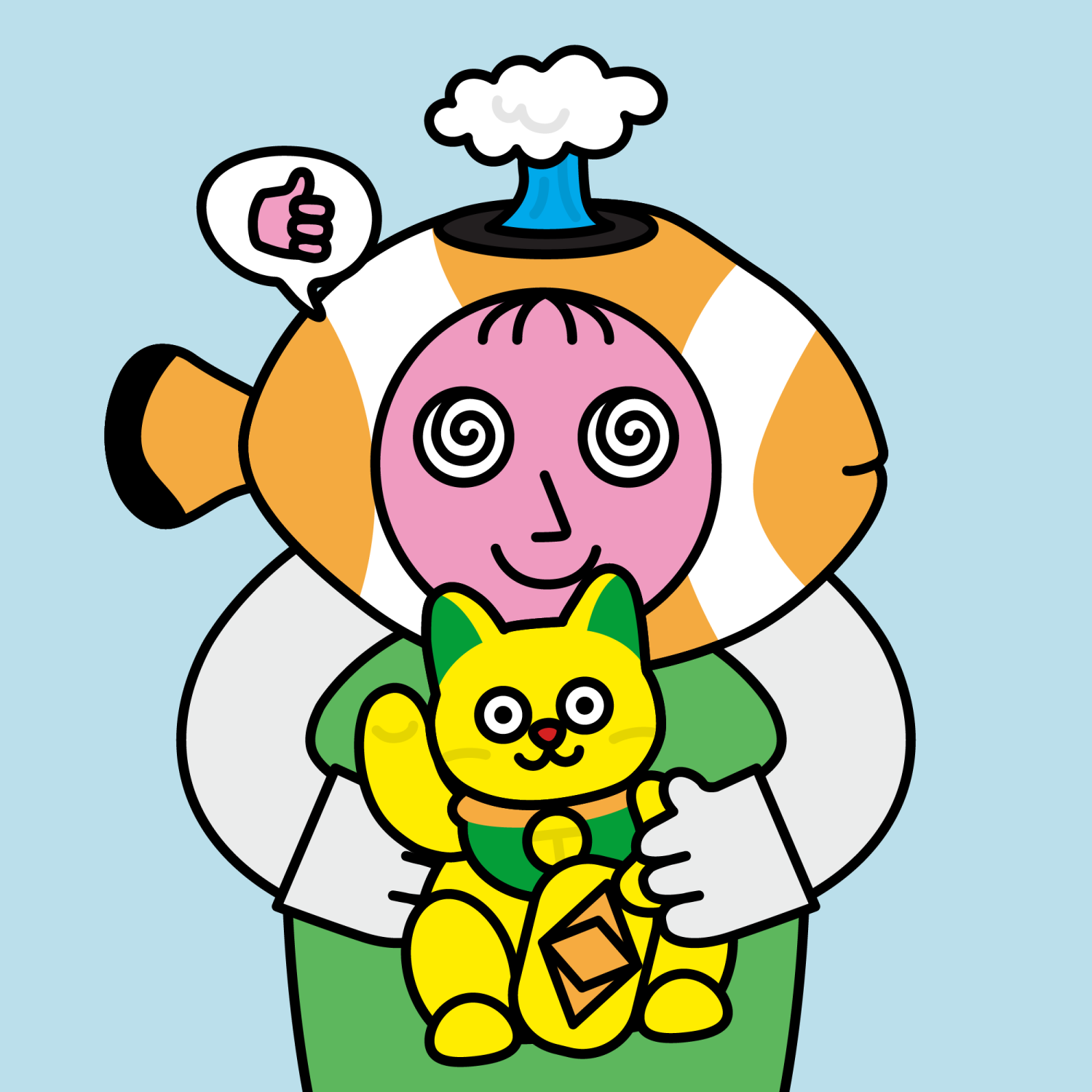 ArmsWhite33.38%BackgroundSky13.97%DialogueThumbs Up11.09%EyesDizzy6.21%Face ColourStrawberry46.38%HairSparse Fringe10.04%Head MiddleOrange Clownfish0.63%Head TopSmoke1.37%Left HandWhite30.00%MouthBig Smile19.64%NoseSharp23.13%PropGold Neko0.66%Right HandWhite30.00%ShirtPlain Green9.09%TribeNeo-Capitalist20.02%