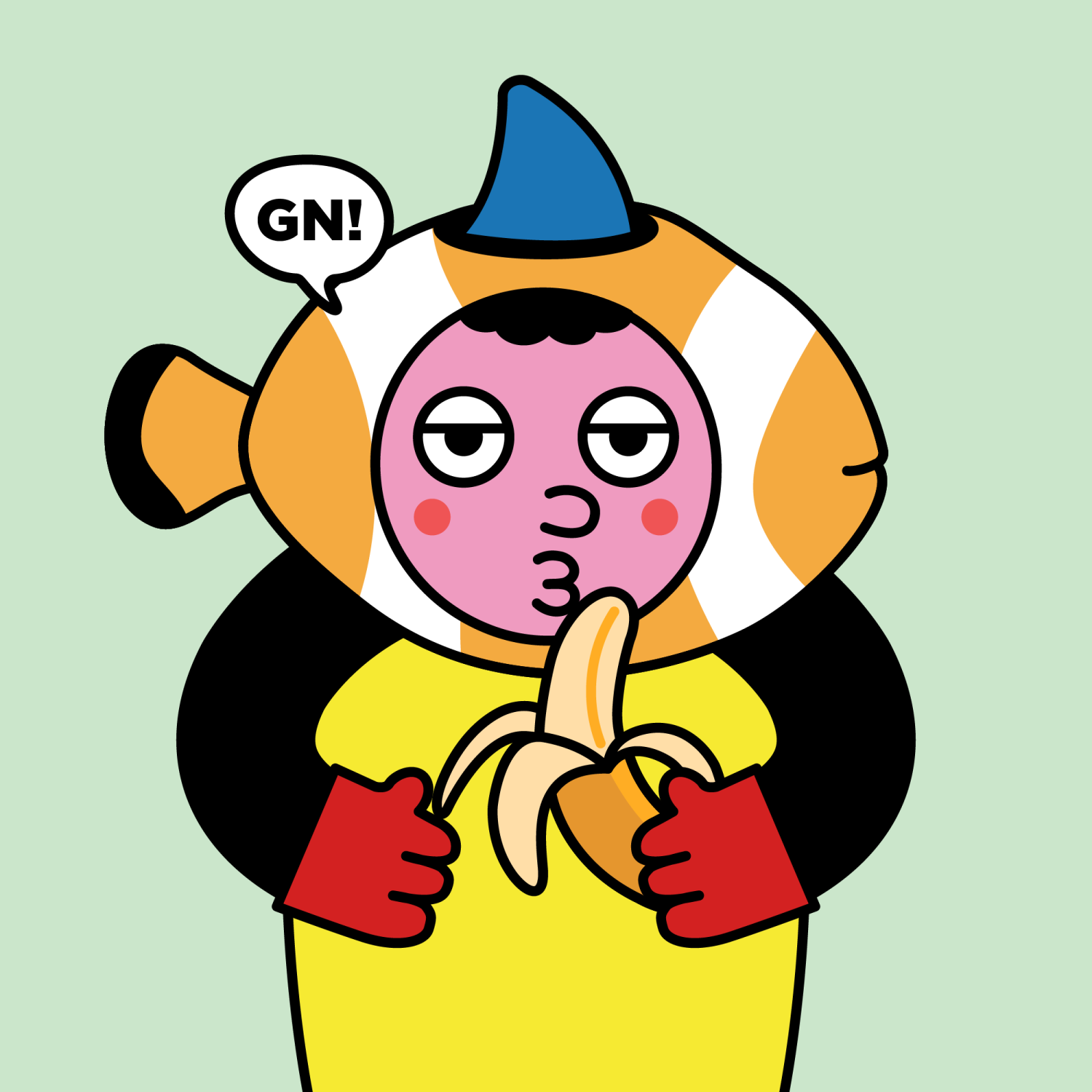 ArmsBlack33.28%BackgroundNature11.30%CheekRosy23.73%DialogueGN!10.28%EyesJudgemental4.78%Face ColourStrawberry46.38%HairCloud Fringe9.72%Head MiddleOrange Clownfish0.63%Head TopBlue Shark1.91%Left HandRed32.25%MouthO11.24%NoseButton10.78%PropBanana0.79%Right HandRed32.25%ShirtPlain Yellow7.90%TribeNeo-Capitalist20.02%