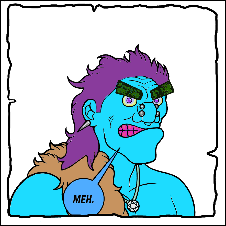 BackgroundWhite2.99%Baseskin No HairSky Blue Crayola Skin3.41%DialogMEH Dialog60.05%Earring AccessoryEarring50.10%EyebrowLincoln Green Eyebrows1.32%EyesEyes181.83%Feather GarmentCamel Feather Garment0.52%FrameWhite Frame32.83%HairMaximum Purple Mullet Hair0.82%MouthMouth154.12%Necklace AccessoryStar of David Necklace50.34%Nose AccessoryNose Ring Accessory17.97%