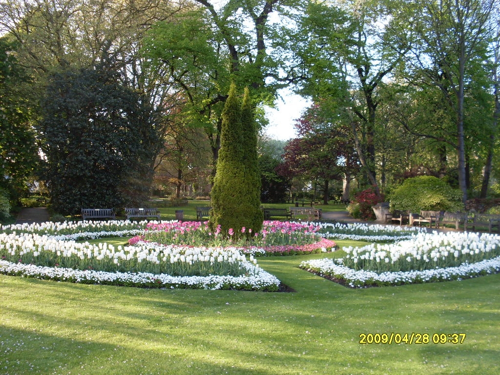 Captured on a serene morning in April 2009, the image showcases a meticulously arranged floral display surrounded by lush greenery.